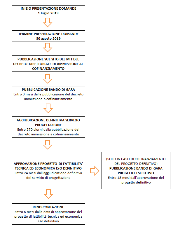 Ai sensi dell’art. 1 comma 1082 della legge 27 dicembre 2017, n. 205, i soggetti beneficiari del cofinanziamento sono tenuti a procedere all'attivazione delle procedure per l'affidamento della progettazione finanziata entro tre mesi dalla pubblicazione del Decreto di ammissione a cofinanziamento sul sito istituzionale del MIT, avvenuta il 18 novembre 2019.